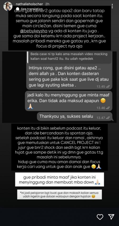Lebih lanjut, Nathalie menjelaskan bahwa konten kolaborasi tersebut dibuat sebelum podcast Erika Carlina bersama Deddy Corbuzier dirilis pada 18 Juli. Karena itu, ia tidak memiliki niat untuk menyinggung atau memperolok situasi kehamilan secara sadar. Baru setelah podcast tersebut viral dan dianggap kontroversial, Nathalie memutuskan untuk membatalkan proyek tersebut dan meminta maaf secara terbuka.