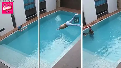 Sang ayah, yang duduk di sisi lain kolam, langsung bertindak tanpa ragu. Ia segera melompat ke dalam air dengan pakaian lengkap—kemeja dan celana denim—tanpa memedulikan dirinya yang akan basah kuyup. Berkat kesigapannya, ia berhasil membawa sang anak ke permukaan air dalam waktu singkat.